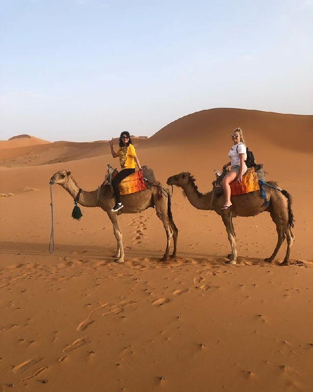 Sahara Morocco Trips' private driver will take you up from your accommodation in Fes. Then we go skiing in Ifrane, which is renowned as Morocco's Switzerland because of its stunning architecture. We proceed to Azrou to see the lives of the native monkeys that live in the cedar forest. You will eat lunch in Midelt, which is known for mineral goods such as selentites. We travel to Errachidia, and you can see Ziz Valley on the way to Erfoud. When we arrive to Merzouga desert dunes, we will prepare for a 1 hour 30 minute camel walk to the desert cmp where we will watch the sunset. You sleep in traditional tents at night. A superb meal and Berber music around the campfire are included in the desert stay.